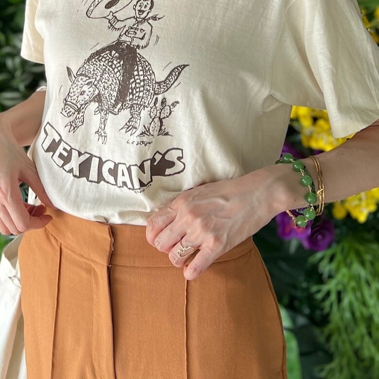 手元を印象的に彩るブレスレットは