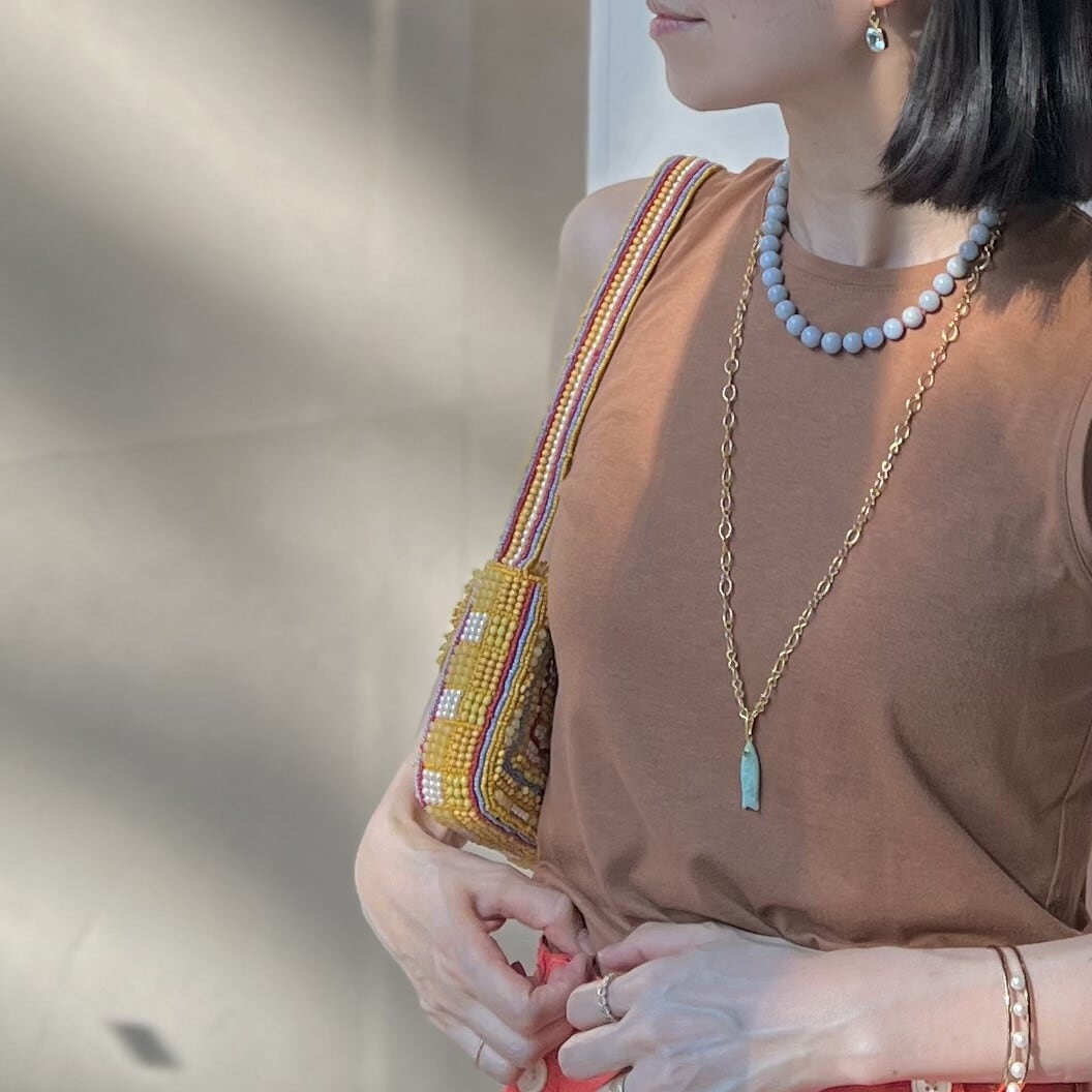 単体づかいでも、他のネックレスとの重ね付けもよく合います。