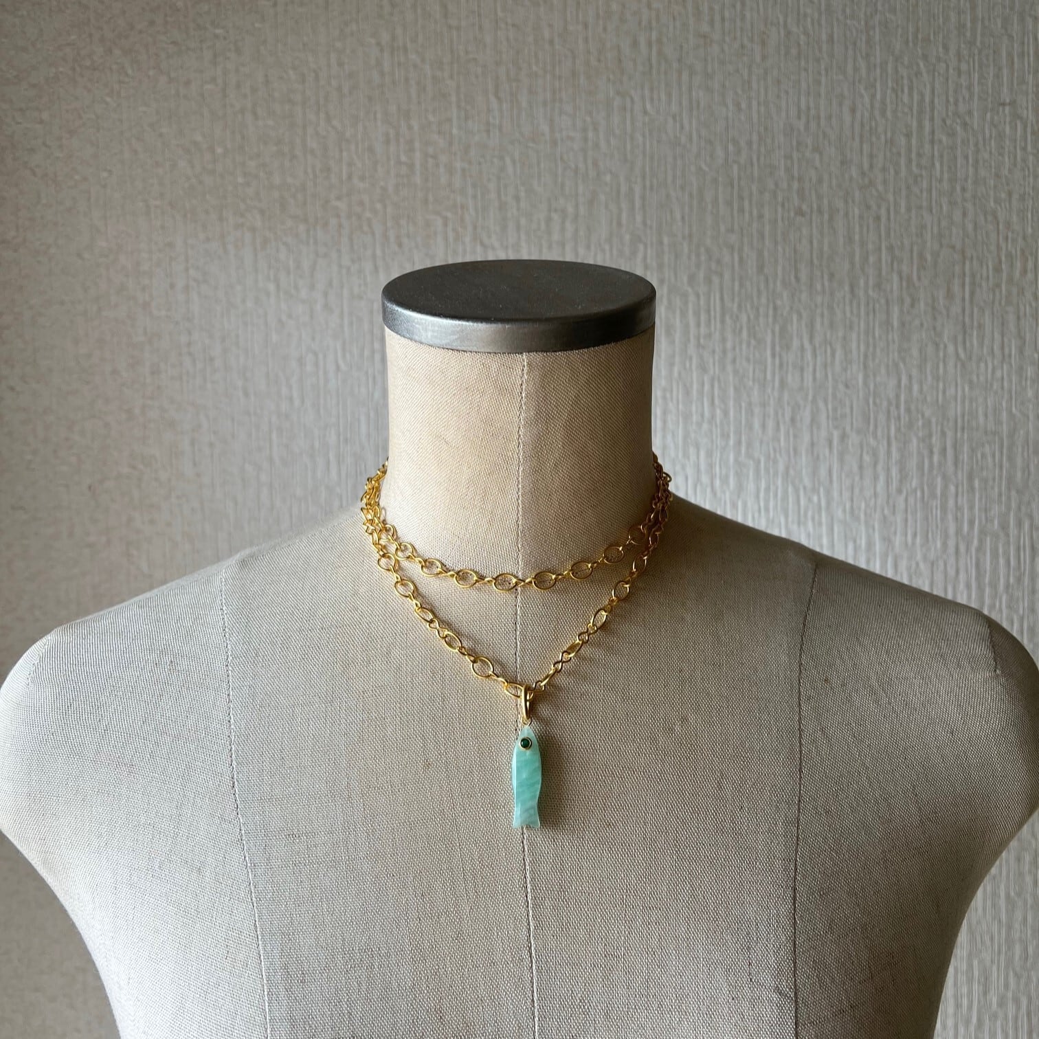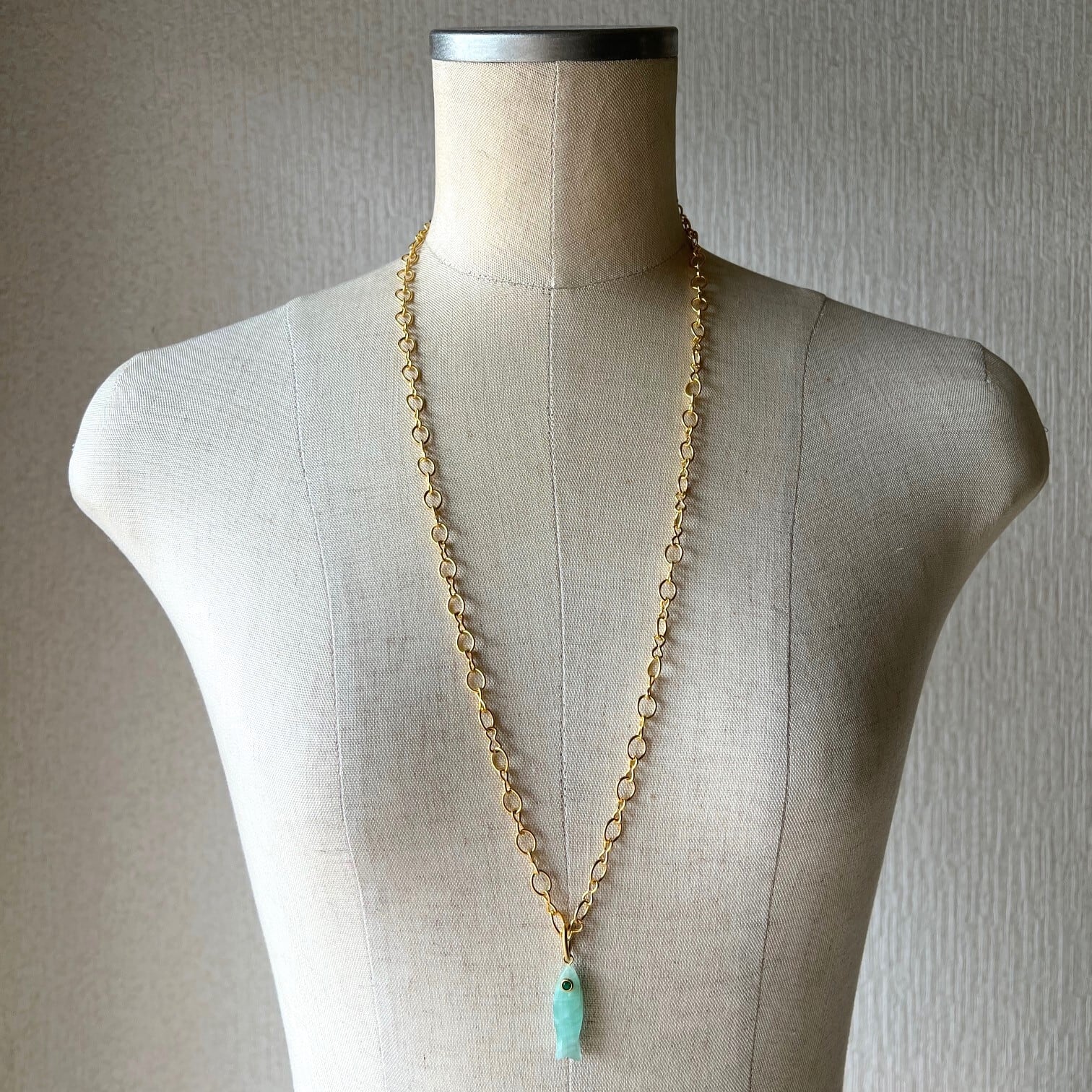 淡いブルーの愛らしいおさかなチャームが良く映えるネックレス。