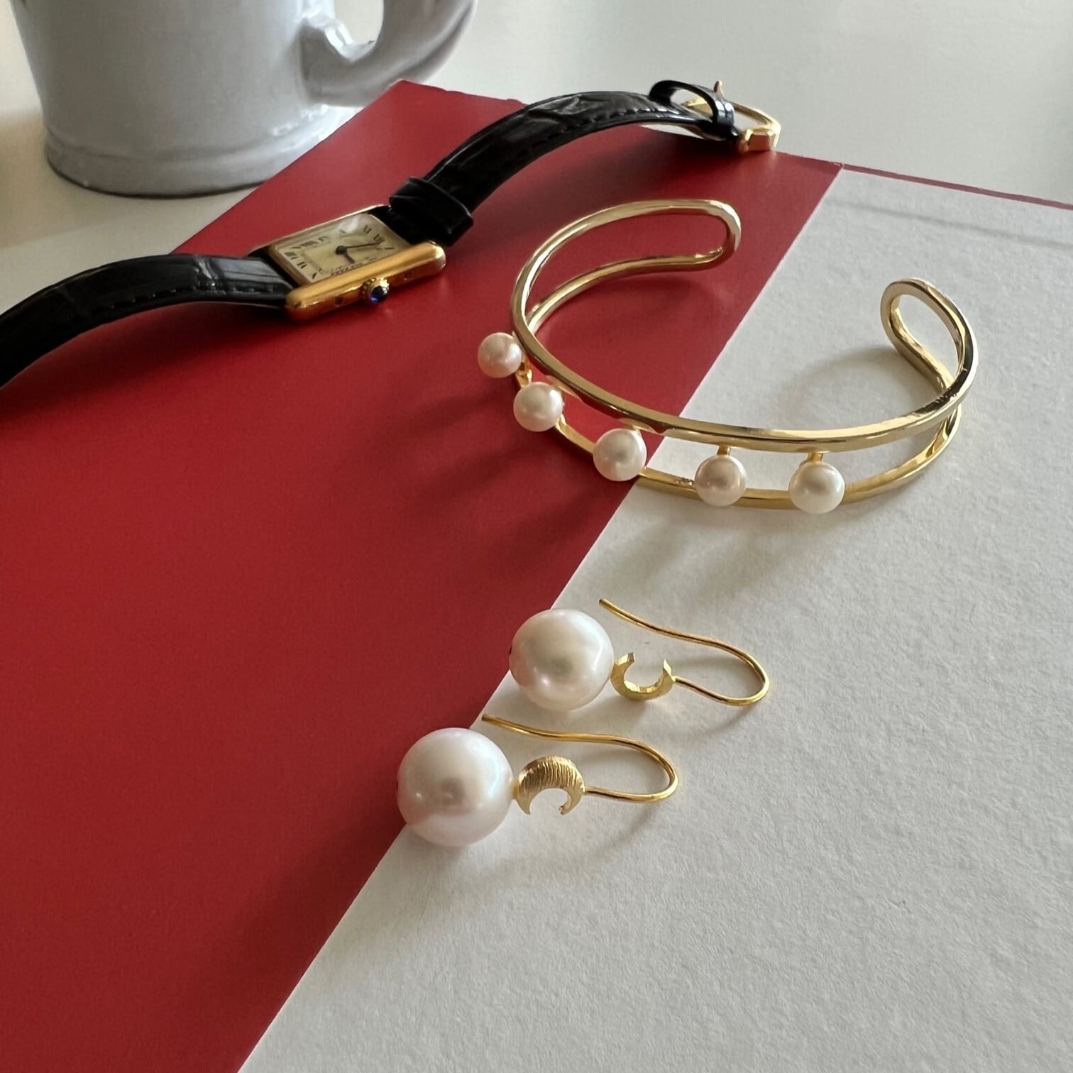 パールを引き立つようにセッティングした上品な印象のバングル。