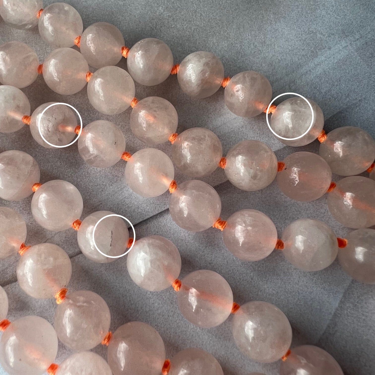 ピンク色のローズクォーツは発色の良いオレンジの糸、