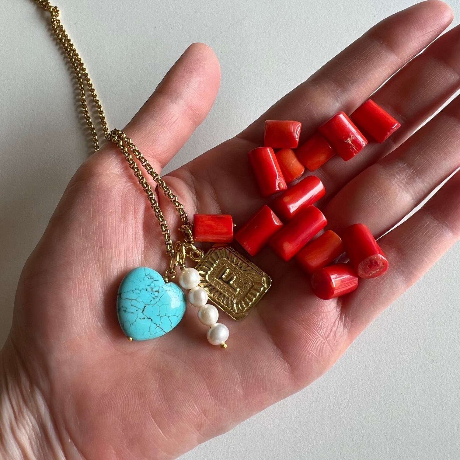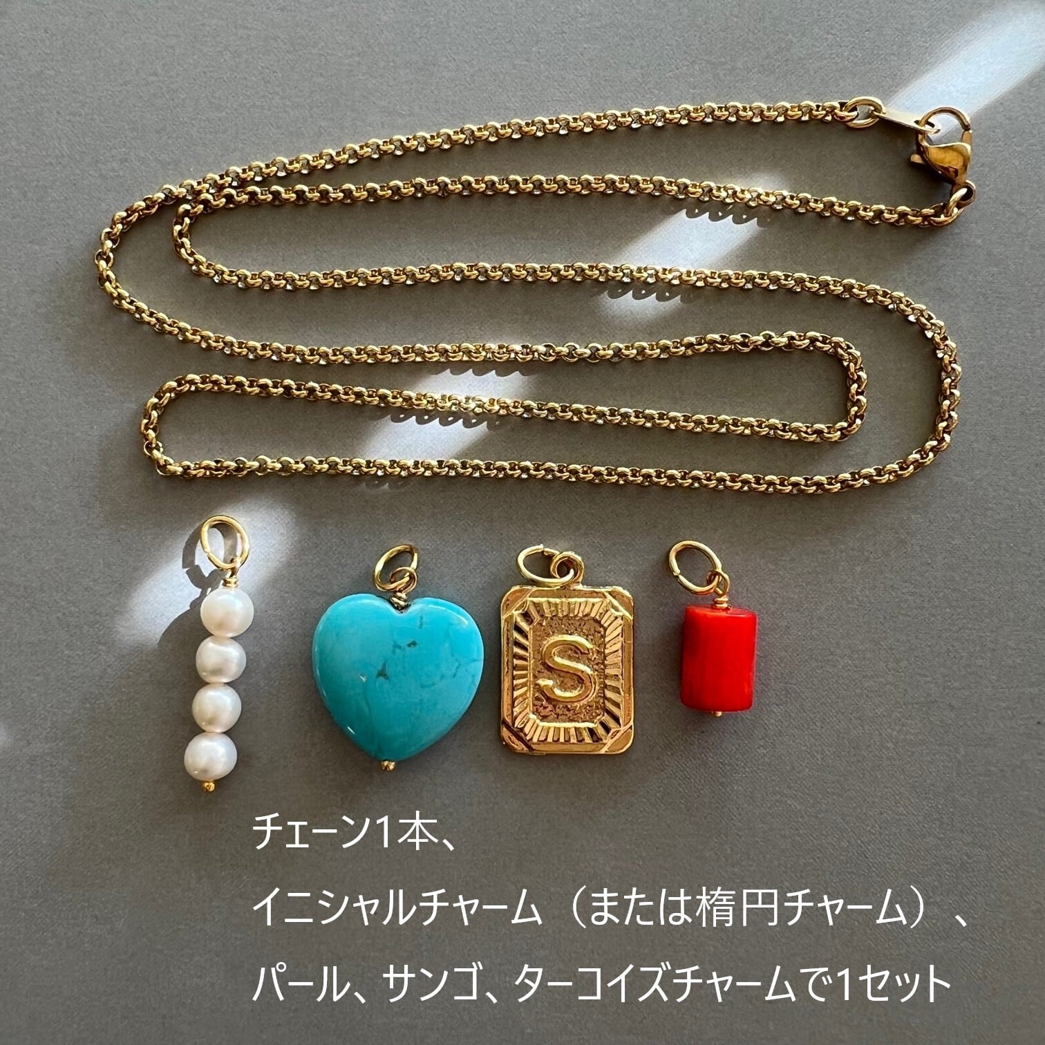 今回はチェーンの素材や長さ、チャームをプラスしての販売です。