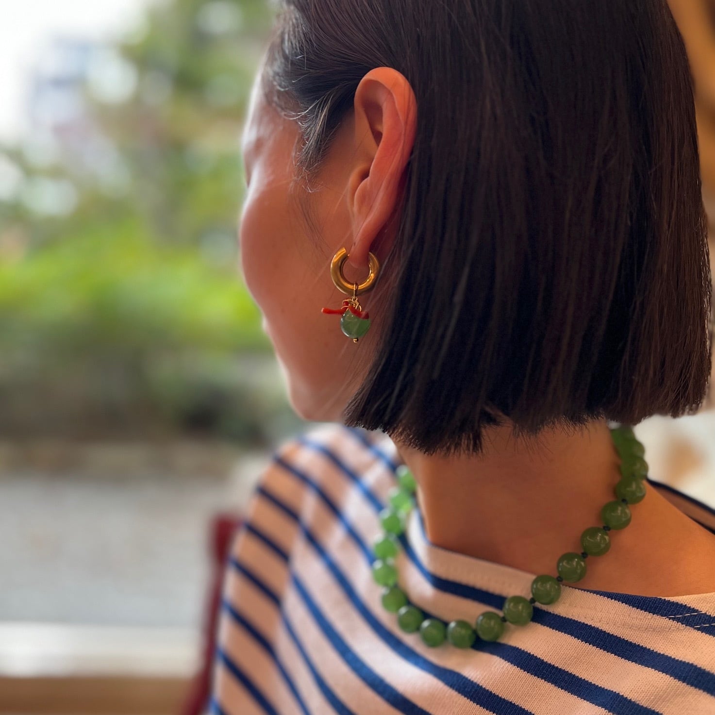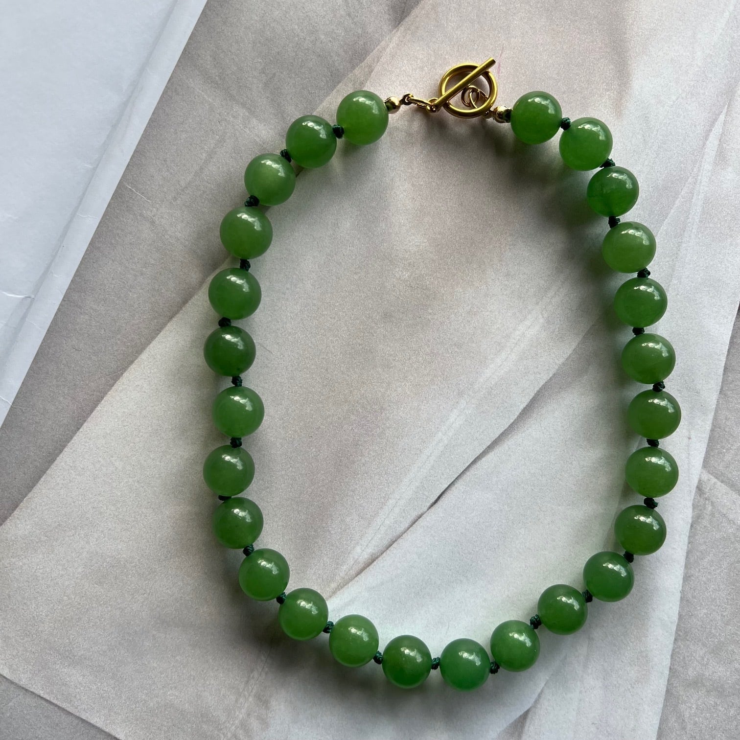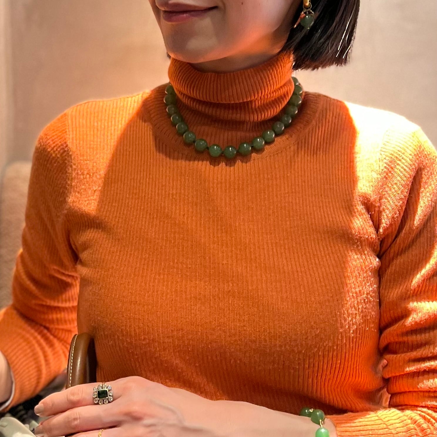 石の色に合わせて深いグリーンの糸で一粒ずつ結んで仕上げたネックレス。