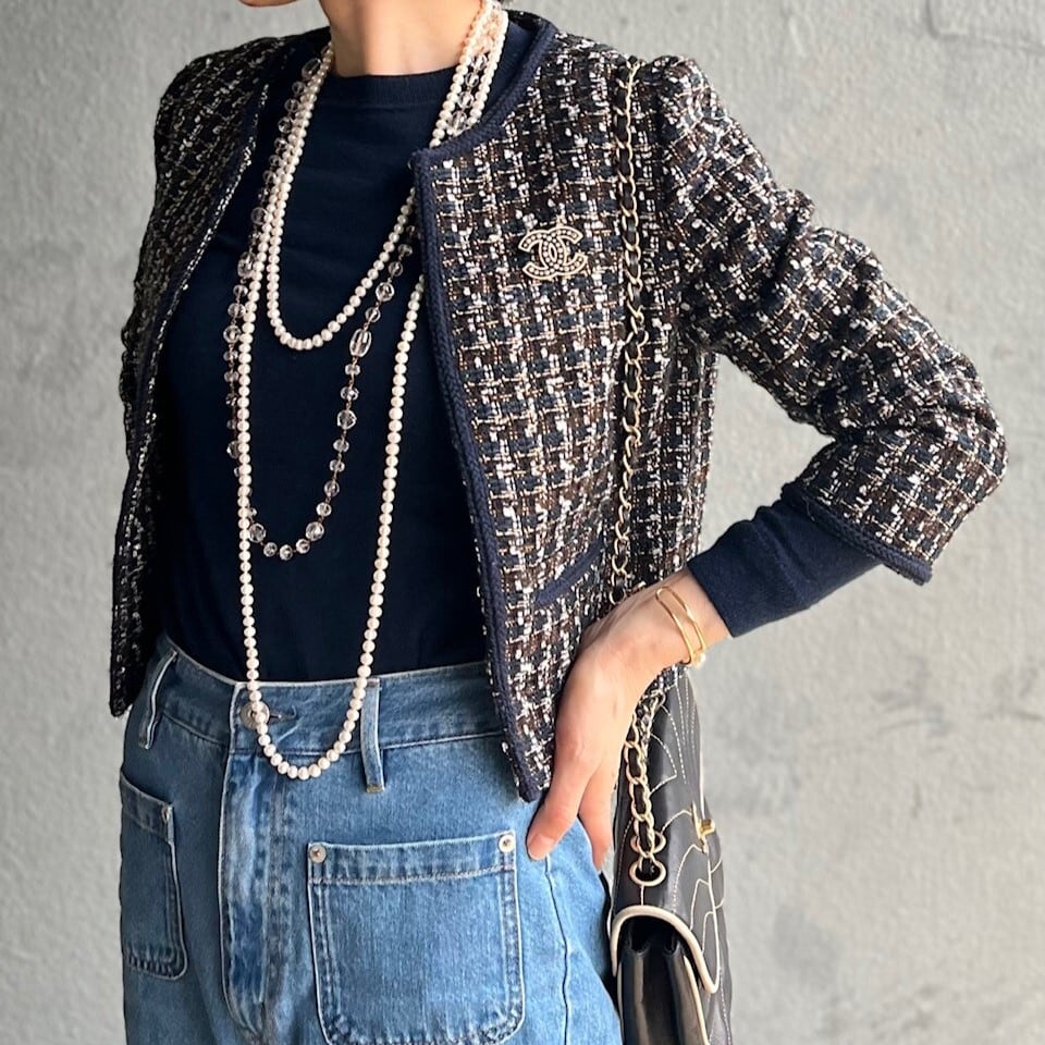 また、お手持ちのチェーンネックレスやパールネックレスをさらに重ねても素敵。